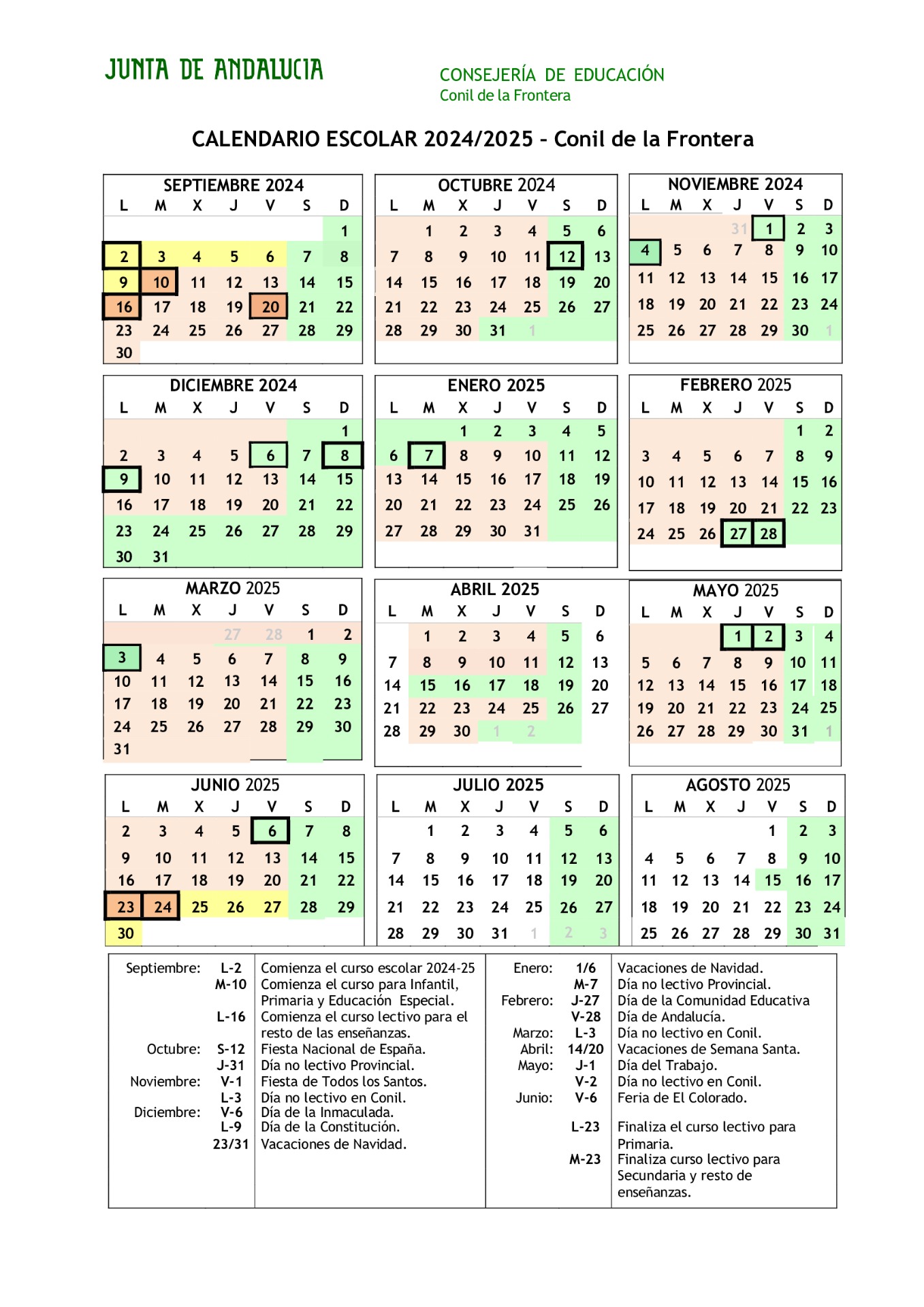 Calendario Escolar 2024-25. Conil de la Frontera